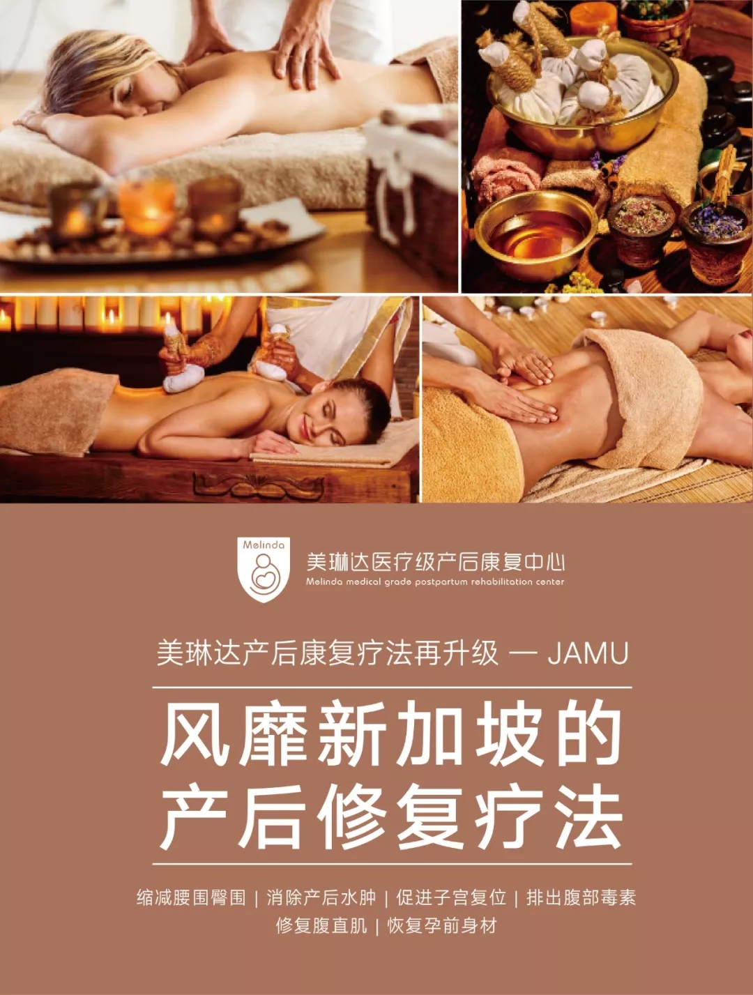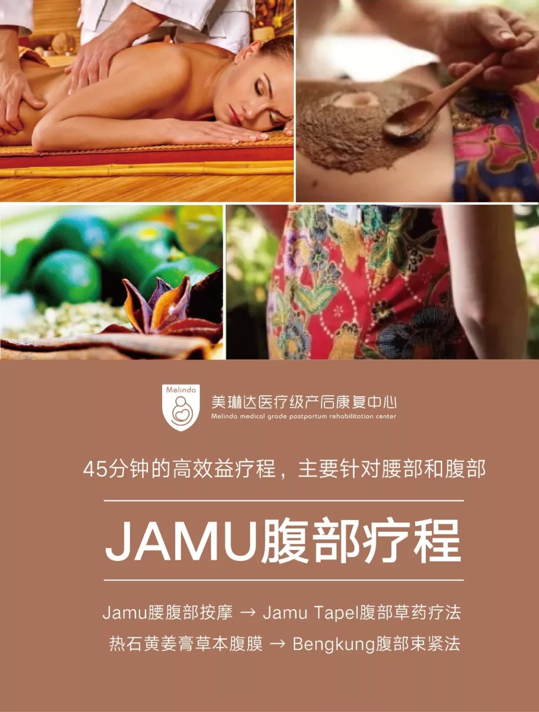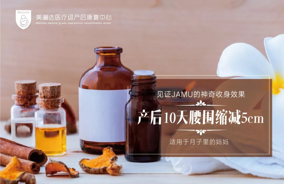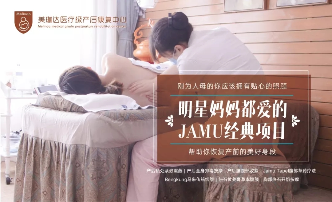 JAMU产后康复术包括产后私处紧致熏蒸、马来传统全身淋巴排毒按摩、JAMU身体疗程、胸部热石开奶按摩等项目,其中45分钟的高效益疗程——JAMU腹部护理疗程是JAMU疗法的核心,对于遭遇产后腹部皮肤松弛、产后腰围和臀围变大、产后腹直肌分离等问题的产后妈妈来说,该疗法尤为适合。