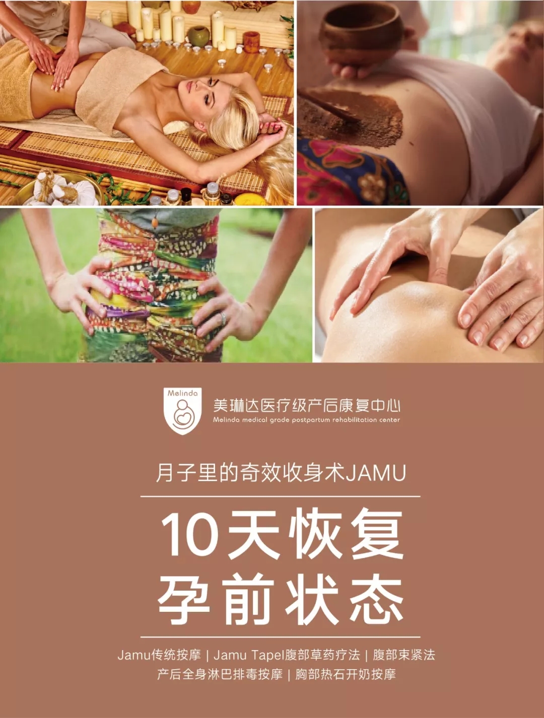 美琳达升级后的JAMU疗法,是融合了中式穴位按摩和传统JAMU按摩的技巧方法,利用中医中的点、揉、搓、梳、拍等手法,在肚脐附近推压,消除产后水肿,排出毒素,帮助子宫尽快复位,从而实现腰腹部的被动瘦身的效果,效果可达3-8公分。